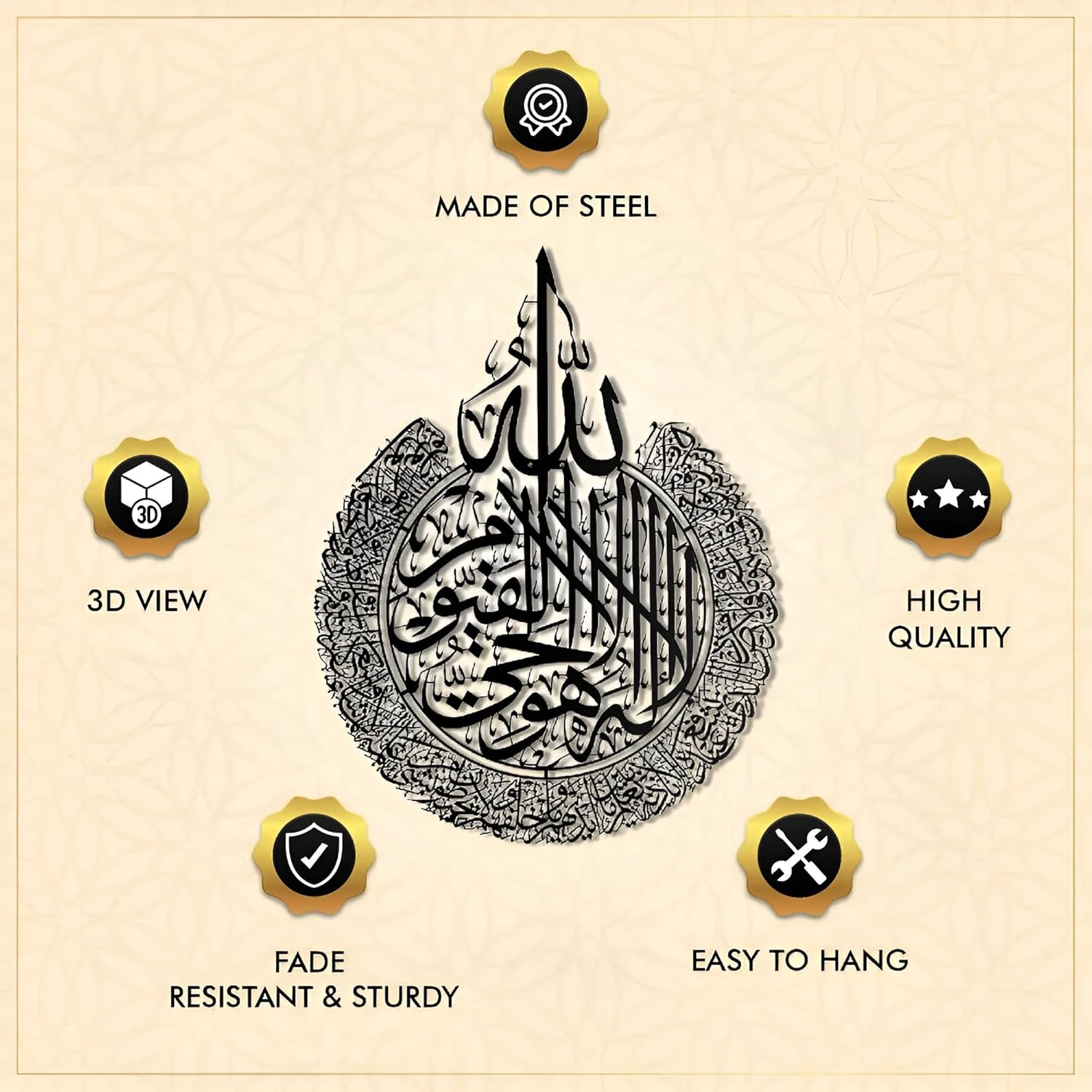 - Sacred Islamic Calligraphy: Features Ayatul Kursi, symbolizing protection, blessings, and divine presence.